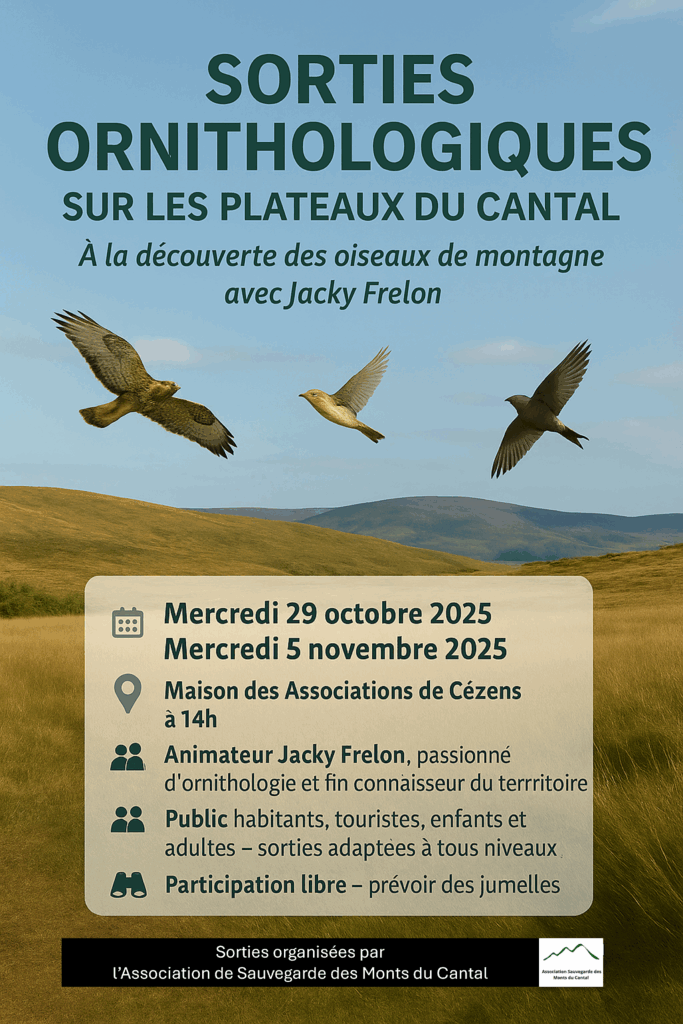 Venez observer, écouter et reconnaître les oiseaux des hauts plateaux cantaliens, en famille ou entre amis! Une expérience nature conviviale et accessible à tous."